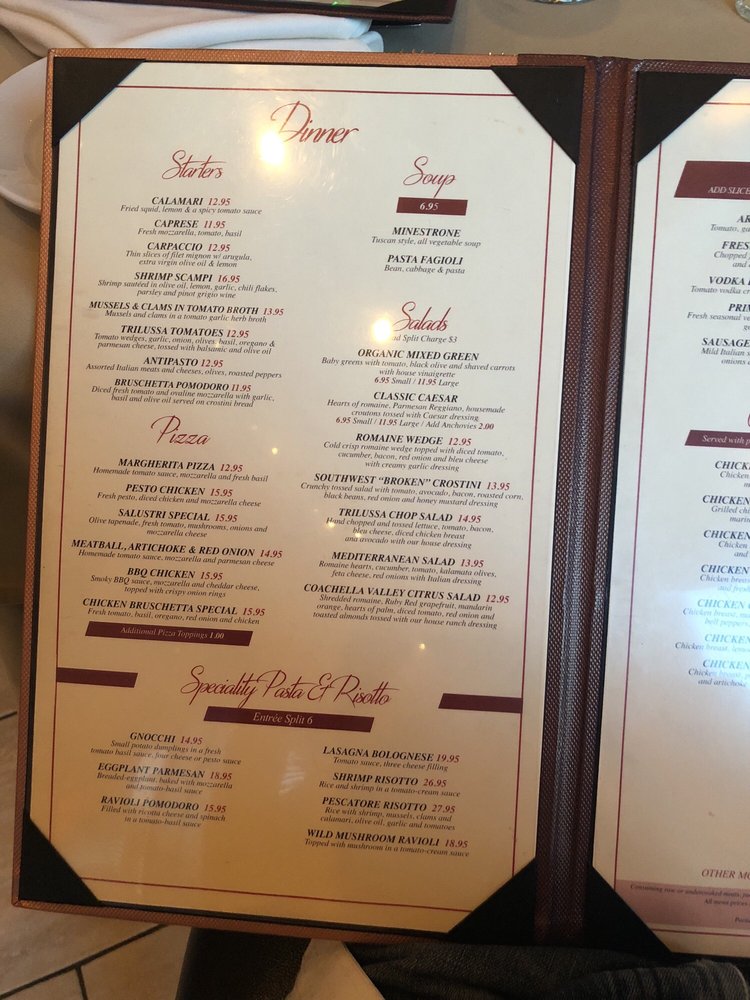 Welcome to Trilussa Ristorante, an Italian gem located on E Palm Canyon Drive in Cathedral City, CA. This charming eatery specializes in delectable pizzas, fresh salads, and authentic Italian dishes, all crafted to perfection.